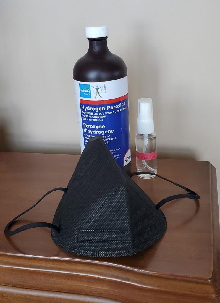 I still have my little spray bottle of hydrogen peroxide to sterilize my masks too, sitting on my buffet. Hydrogen peroxide, used as a steam after each use, has been shown to sterilize masks well enough for hospital re-use up to 30 times, so we know peroxide kills COVID and doesn’t damage the mask. When coupled with rotating masks so they’re only worn every 3 to 4 days (also known to kill off the virus) I feel safe re-wearing masks until they are obviously soiled. I’m hoping someone will test this cleaning method but, until then, I’ll keep my 4 masks lined up, spraying each after wearing it, and putting it at the back of the line, as this is the best practical method of sanitizing I know of!